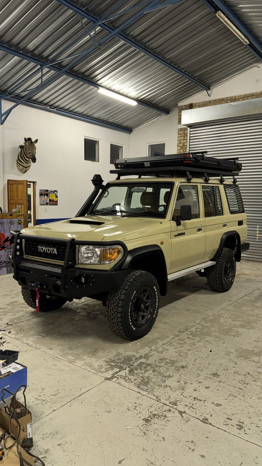 A truly one of a kind 2015 Land Cruiser 76 Series from South Africa outfitted for the ultimate over landing with a 270 awning, roof top tent, camping shower, and rugged suspension. A touch of class with the custom quilted leather interior for a spectacular interior. The engine and transmission has not been chosen (TBD by buyer); the standard power option would include a Cummins 4BT along with the original H151 manual transmission. The power option could be upgraded to many option and an automatic transmission if desired.