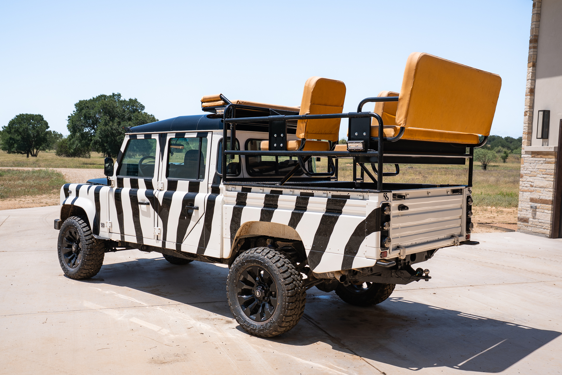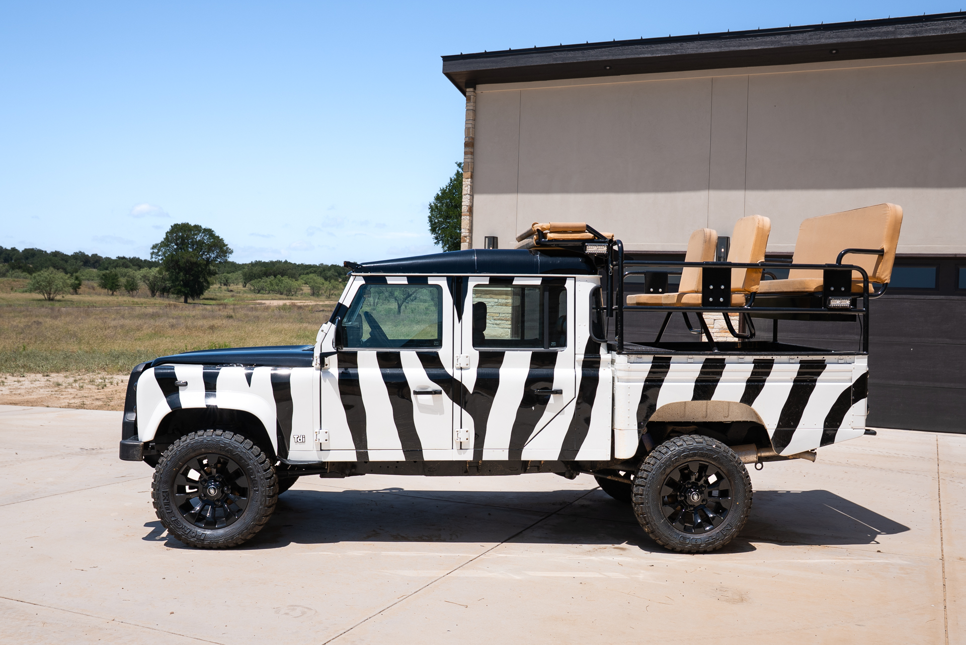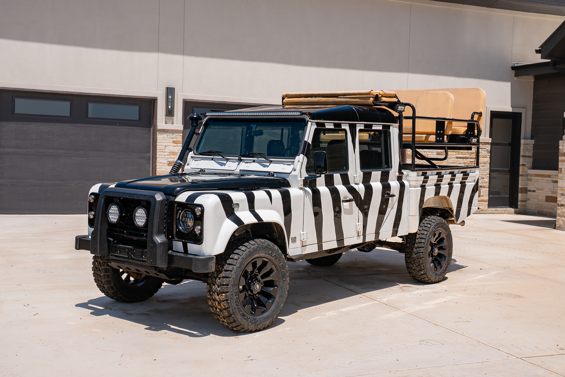 A truly custom built Defender for a private Safari Ranch with a Zebra appearance and Safari High Seats. It wouldn't be a true Texas Land Cruiser build without a custom quilted black interior and touchscreen display with Apple CarPlay. Decked out with lights on every side, nothing will be left in the dark!