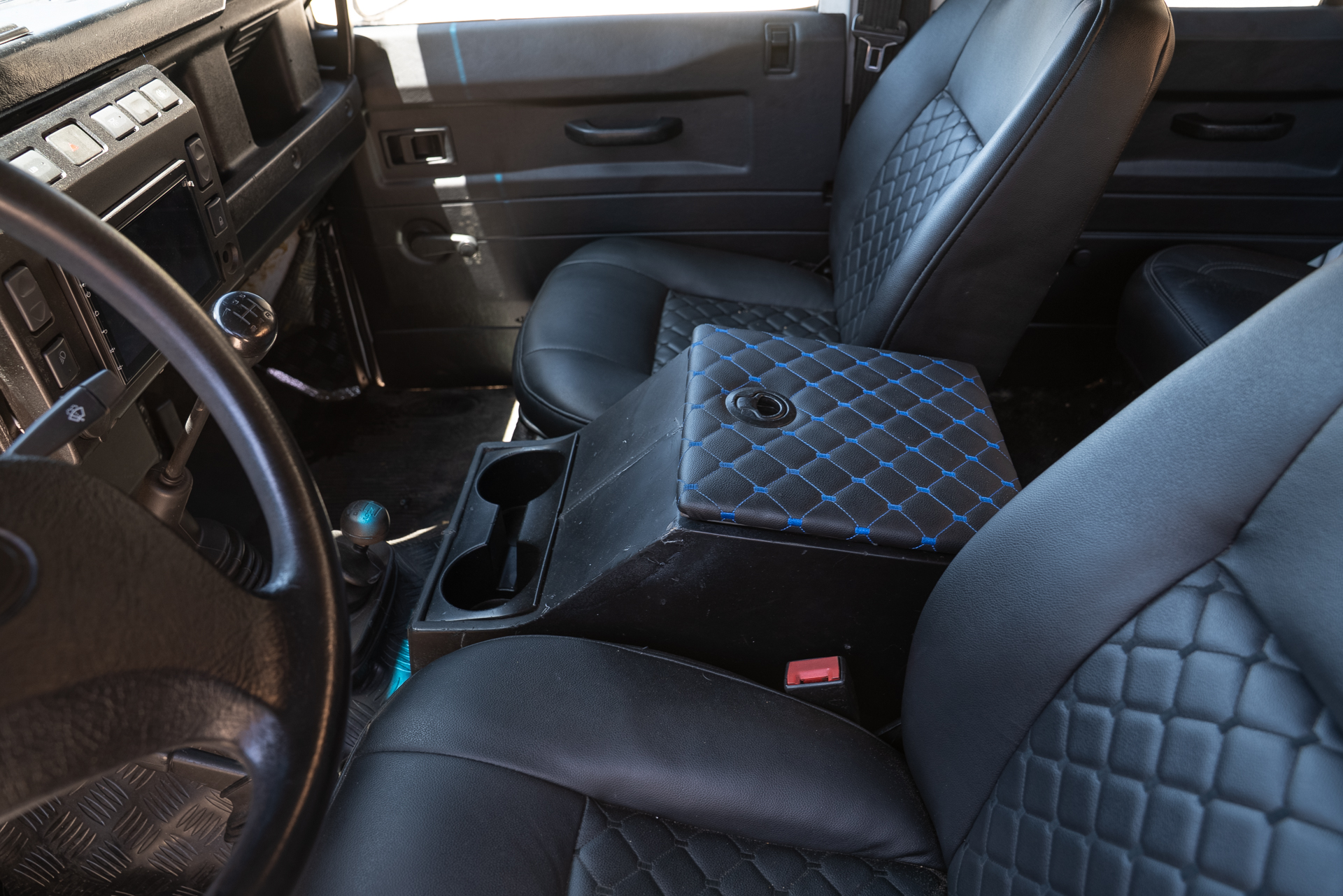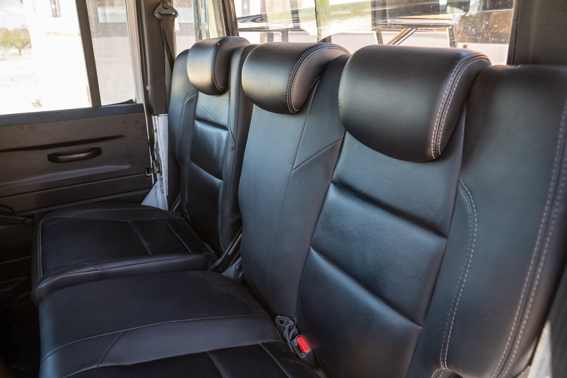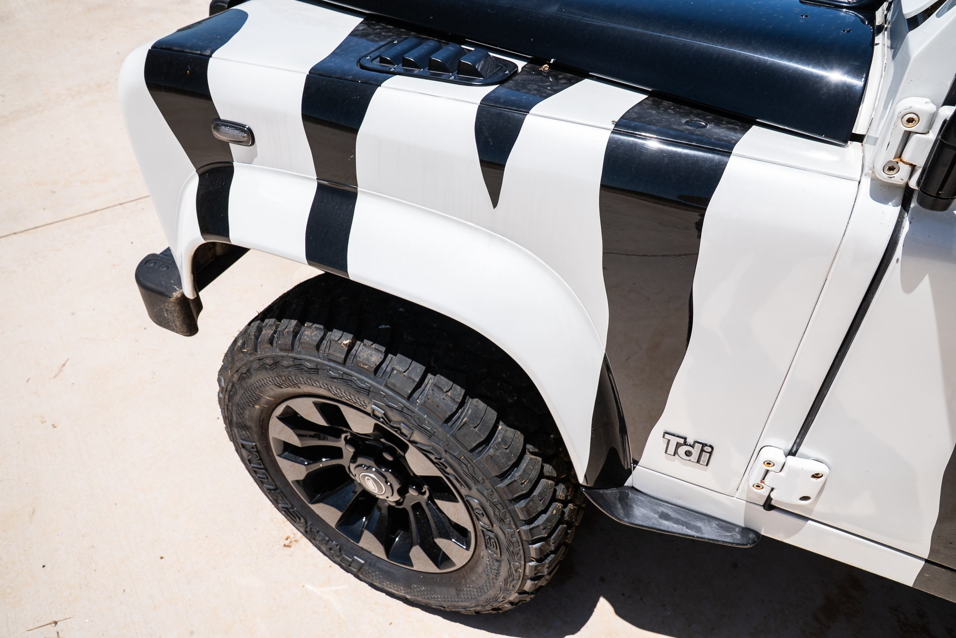 A truly custom built Defender for a private Safari Ranch with a Zebra appearance and Safari High Seats. It wouldn't be a true Texas Land Cruiser build without a custom quilted black interior and touchscreen display with Apple CarPlay. Decked out with lights on every side, nothing will be left in the dark!