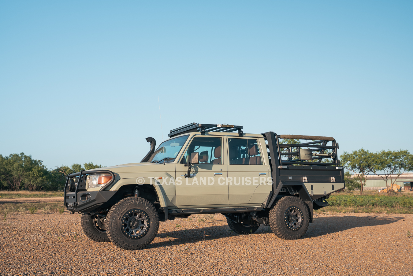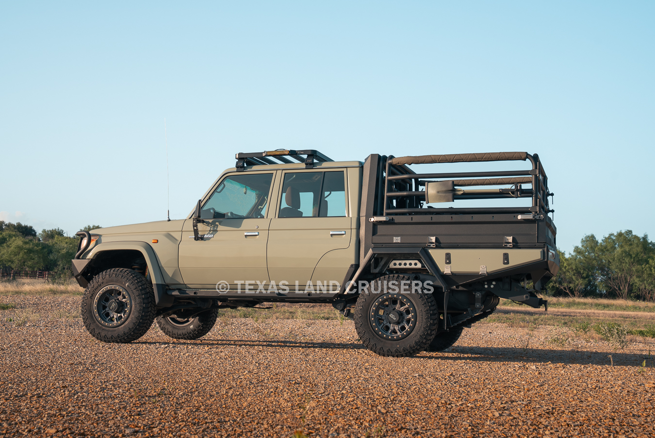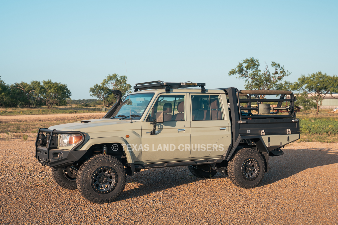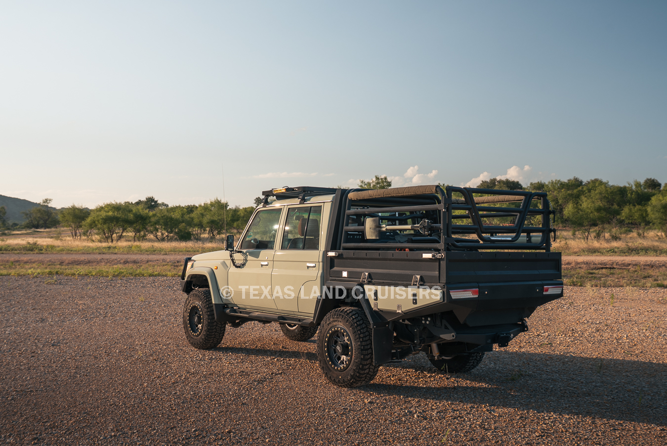 2014 Toyota Land Cruiser 79, complete frame off restoration in Nardo Green over a Chocolate leather interior. Under the hood is a 6 cylinder Cummins 5.9L diesel backed by a rebuilt 5 speed manual, new suspension, new lockers, rebuilt differentials and hubs, and a recoated chassis. The work speaks for itself the moment you see it in person. Inside you get a new leather interior with a CarPlay capable touch screen, A/C system, and cruise control. Outside it sits on new Dirty Life rims with 33" A/T tires, custom paint, a Safari flat bed, and a Wildog bumper. Options include a leather upgrade, 2" lift, SMC light outfit, off road tools, water tanks, engine and sound upgrades, and rock sliders. A fully sorted 79 series that is ready for real use on and off-road.