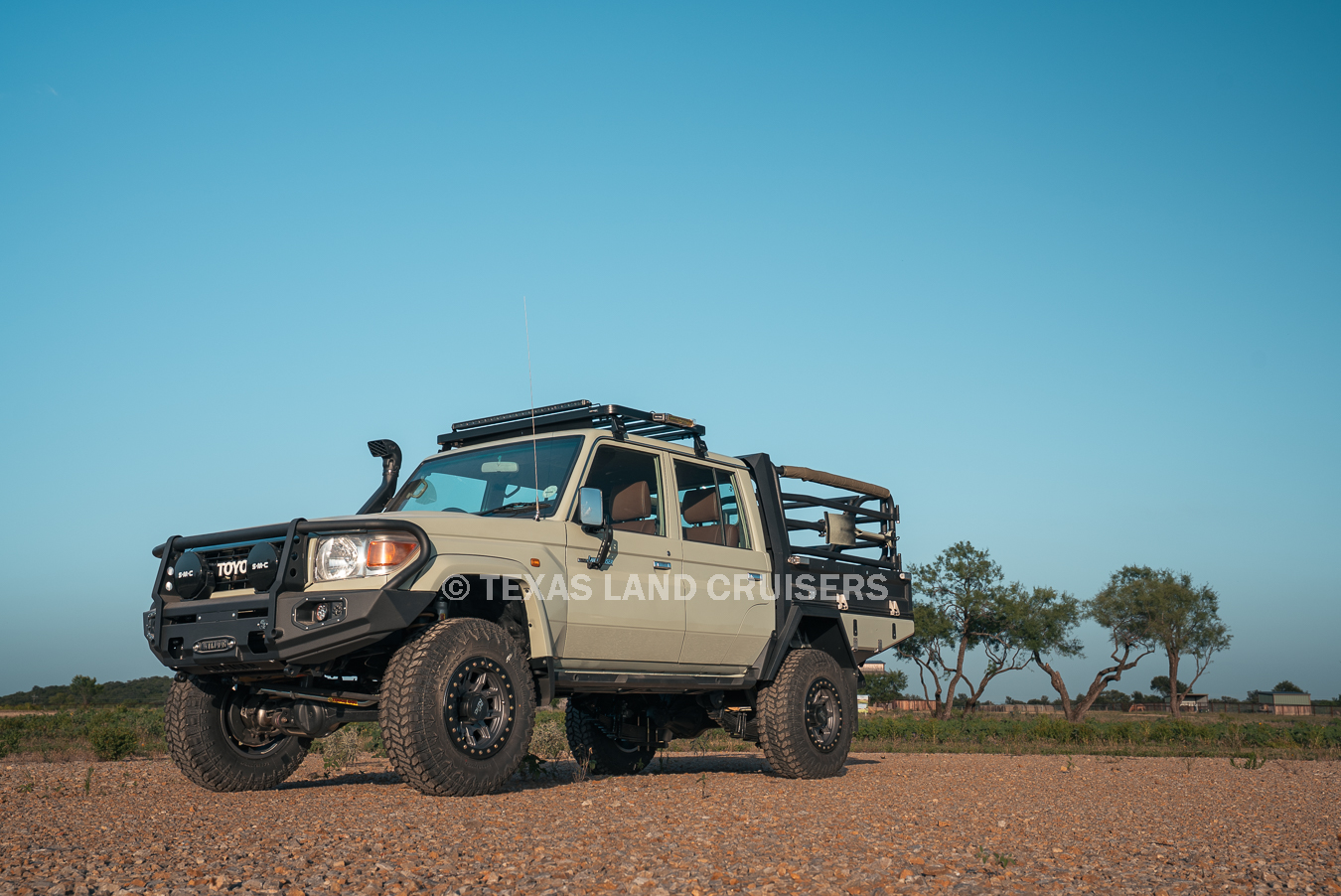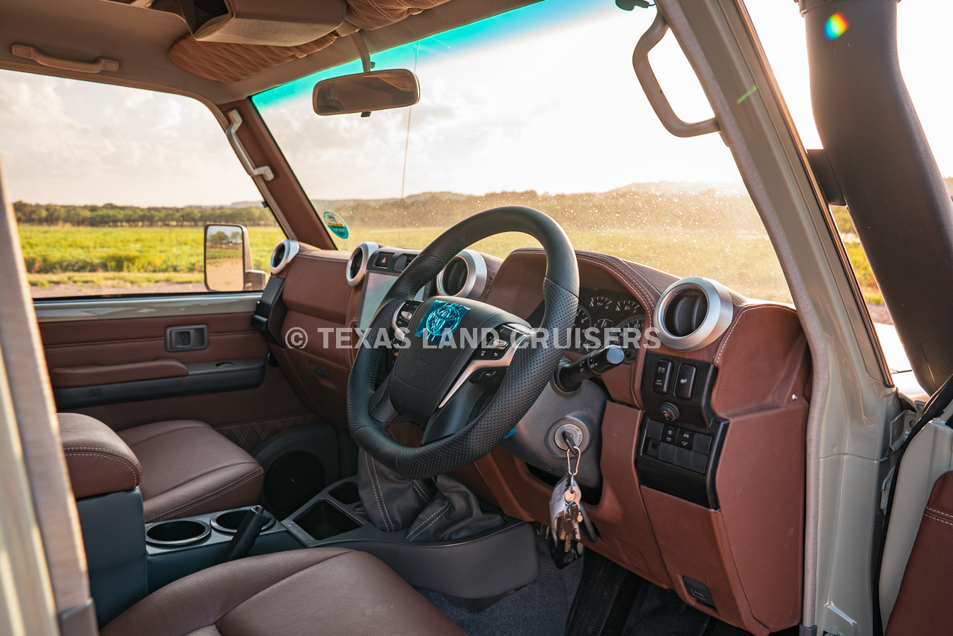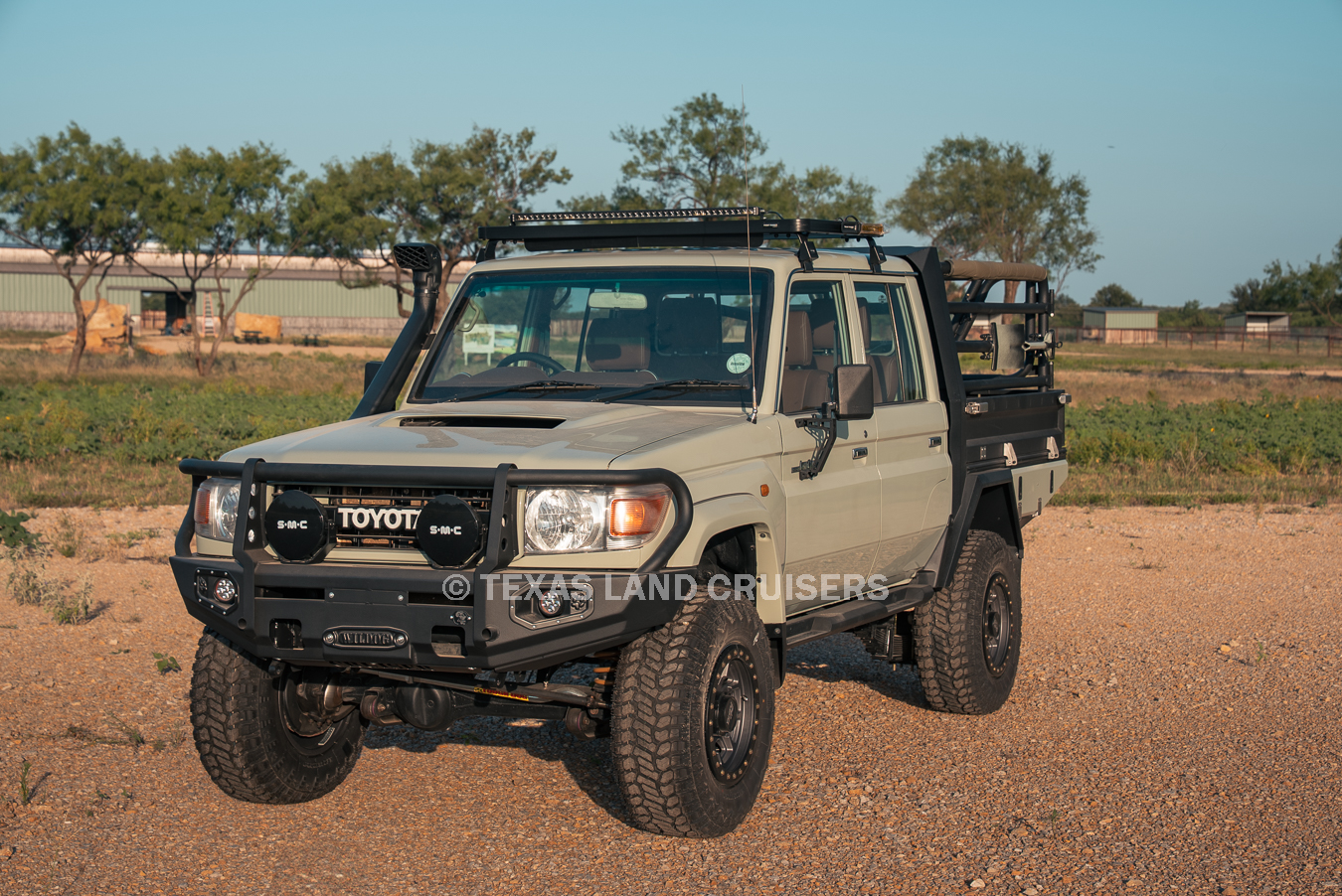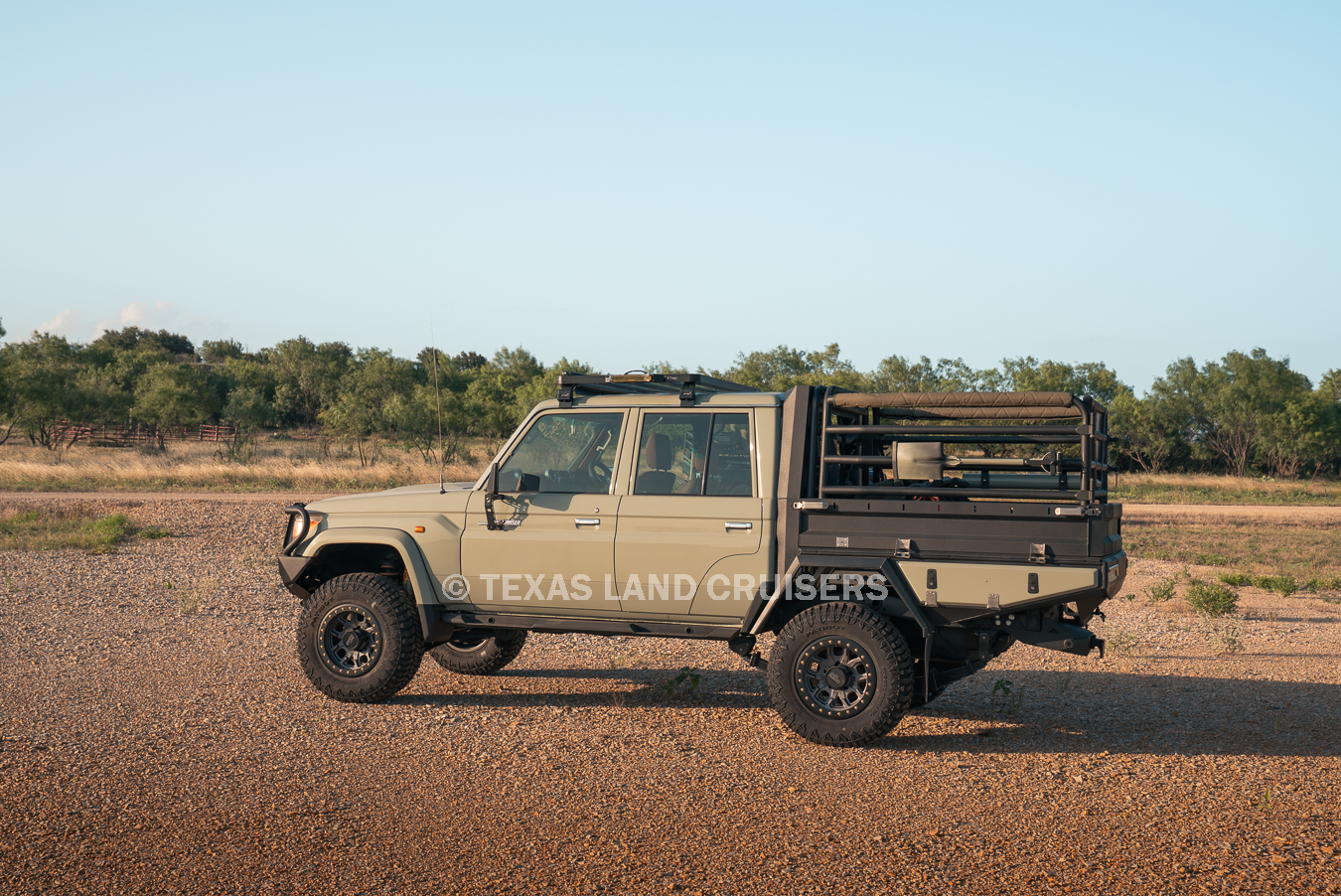 2014 Toyota Land Cruiser 79, complete frame off restoration in Nardo Green over a Chocolate leather interior. Under the hood is a 6 cylinder Cummins 5.9L diesel backed by a rebuilt 5 speed manual, new suspension, new lockers, rebuilt differentials and hubs, and a recoated chassis. The work speaks for itself the moment you see it in person. Inside you get a new leather interior with a CarPlay capable touch screen, A/C system, and cruise control. Outside it sits on new Dirty Life rims with 33" A/T tires, custom paint, a Safari flat bed, and a Wildog bumper. Options include a leather upgrade, 2" lift, SMC light outfit, off road tools, water tanks, engine and sound upgrades, and rock sliders. A fully sorted 79 series that is ready for real use on and off-road.